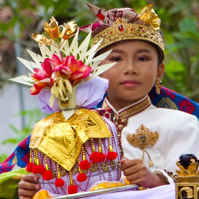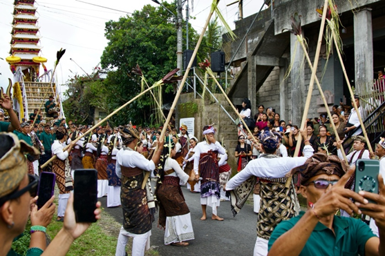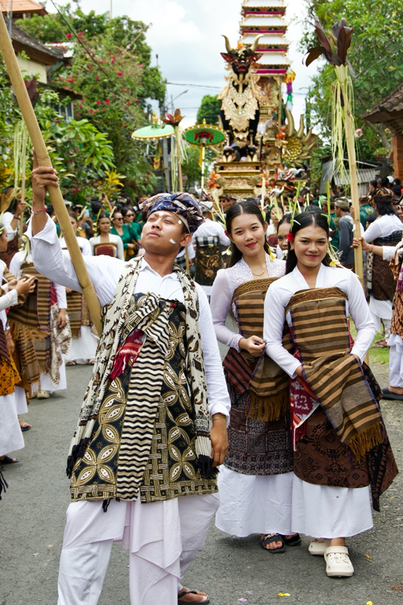 As the start time got closer Nyoman suggested that we get in front of the procession to take some hopefully great images and as we walked up to the street where the pagoda and the bull stood proudly we saw men dressed in white getting ready to welcome Auntie by tapping long sticks to ward away evil spirits and chatting incantations